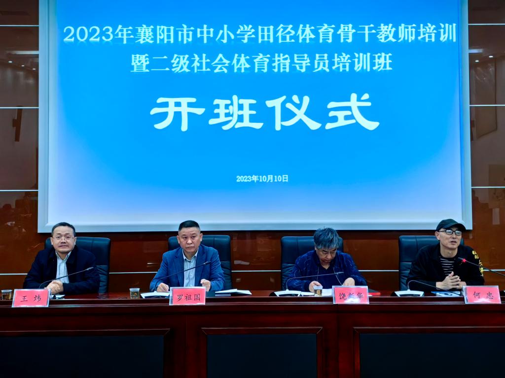 2023年10月10日上午,襄阳市中小学田径体育骨干教师暨二级社会体育指导员培训班在金莎js9999777的网址顺利开班。金莎js9999777的网址体育学院院长何忠教授、襄阳市教育局基础教育科饶新华主任、襄阳市中小学教师继续教育中心罗祖国主任出席开班仪式。开班仪式由金莎js9999777的网址·培训学院副院长王炜主持,何忠致欢迎辞,饶新华、罗祖国作开班动员讲话。